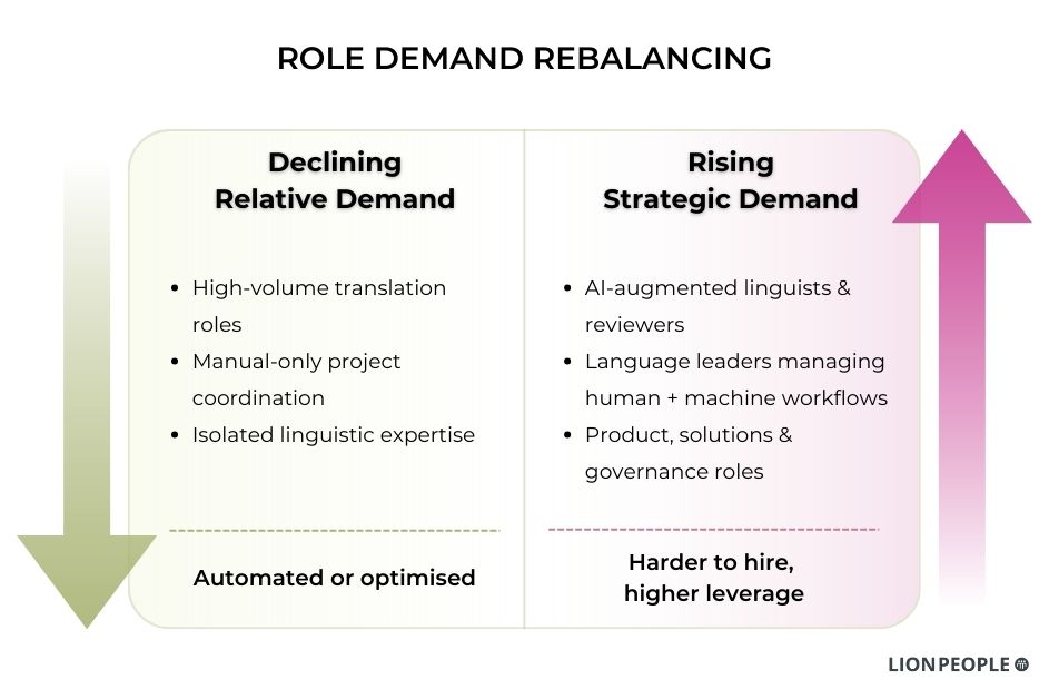Pure language roles will continue to decline in relative importance. Demand will concentrate around professionals operating at the intersection of language, technology, and business strategy.